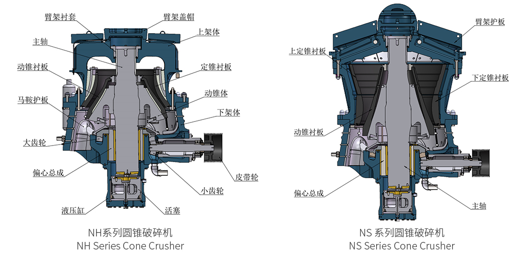 電機經(jīng)由大小齒輪帶動偏心套組件旋轉(zhuǎn),由偏心套組件迫使主軸以懸掛點為中心,繞機器中心線旋擺運動。動錐的運行軌跡看起來是在破碎腔內(nèi)來回擺動,同時緩慢的旋轉(zhuǎn)。物料被擺動的動錐擠壓破碎;