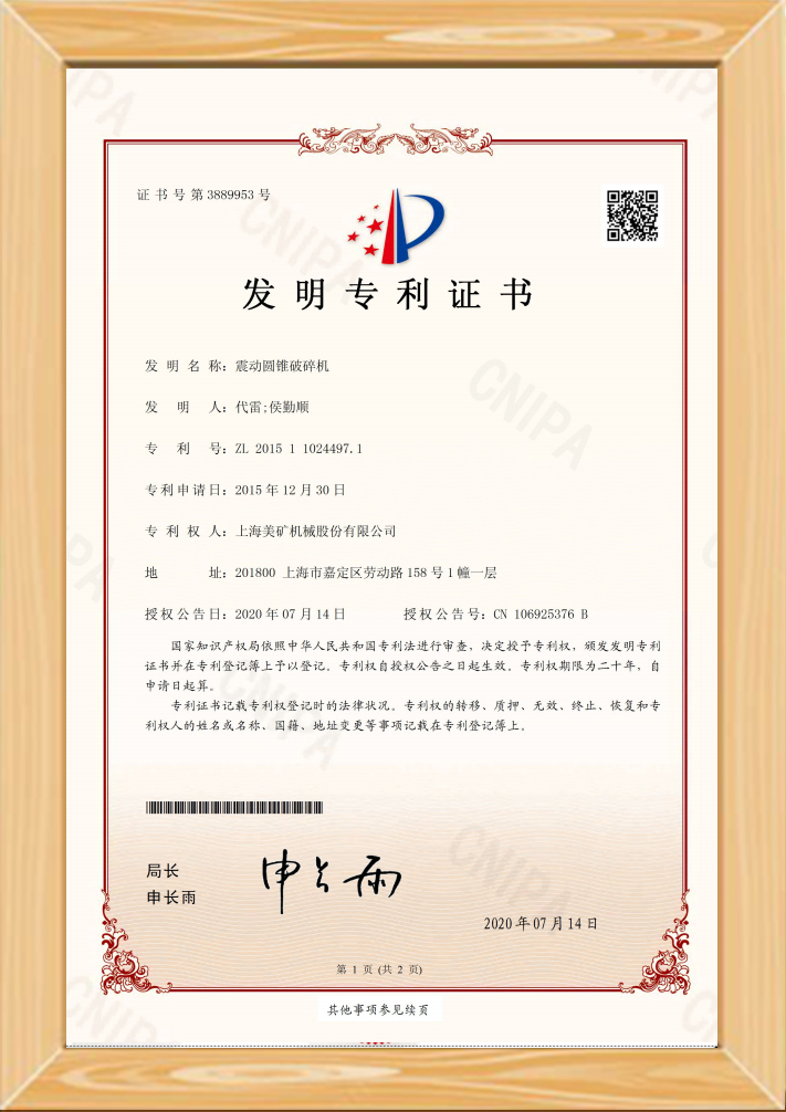 • 一種自動加注潤滑脂的圓錐破碎機水平軸總成專利證書
