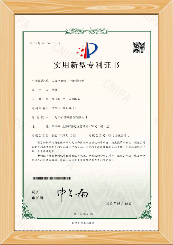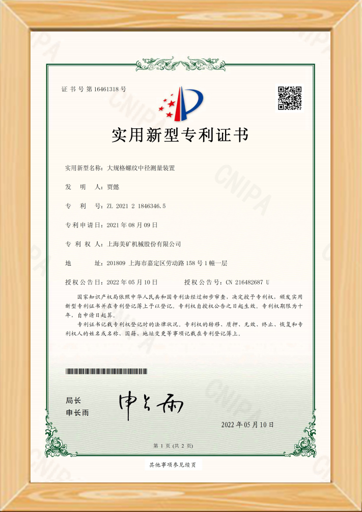 • 大規(guī)格螺紋中徑測量裝置實用新型證書