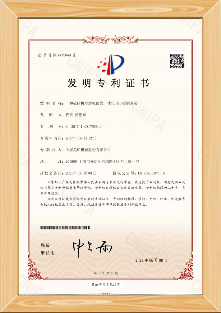 • 一種破碎機球磨機破磨一體化PMB控制方法專利證書